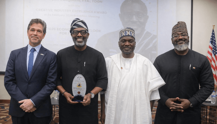 Filmmaker, Femi Odugbemi, who plays many roles in the Nigerian creative sector, received the Creative Industry Excellence Award at the Nigeria-American Chamber of Commerce Economic Outlook Roundtable 2026, presented in the presence of policy and economic officials including Alhaji Sheriff Balogun, President and Chairman of Council of the Nigeria-American Chamber of Commerce; Dr. Michael Ervin, Political and Economic Chief, U.S. Consulate General Lagos; Dr. Tayo Aduloju, Chief Executive Officer of the Nigerian Economic Summit Group; Dr. Tope Fasua, Special Adviser to the President on Economic Matters; and Dr. Ikenna Nwosu, Chairman of the NACC Programming Team.